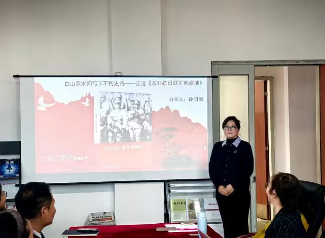 为深入学习贯彻习近平总书记关于“用好红色资源、传承红色基因”的重要指示精神,在纪念中国人民抗日战争胜利80周年之际,马克思主义学院于11月4日下午在学院会议室举办了题为白山黑水间写下不朽史诗——走进《东北抗日联军创建地》的读书分享会。本次分享会由马克思主义学院教师孙明丽主讲,学院全体教师参加。