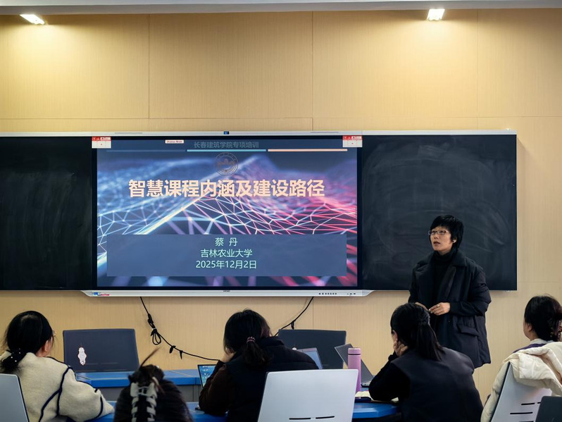 本次活动特邀吉林农业大学教师教学发展中心副主任蔡丹教授担任主讲教师。蔡丹教授聚焦教育教学数字化转型需求,作题为《智慧课程内涵及建设路径》的专题报告,并从智慧课程的建设背景、内涵要素、建设路径以及相关案例四个方面展开讲解。她分别从智慧课程建设的政策背景、学习革命、技术驱动等方面点明智慧课程建设的必要性和必然性;引入专家的观点见解帮助参会教师理解智慧课程的科学内涵和要素;通过教学设计、教学方法、教学评价等教育教学环节讲解智慧课程建设的现实路径;以丰富的智慧课程建设案例激发参会教师投身智慧课程建设的热情。