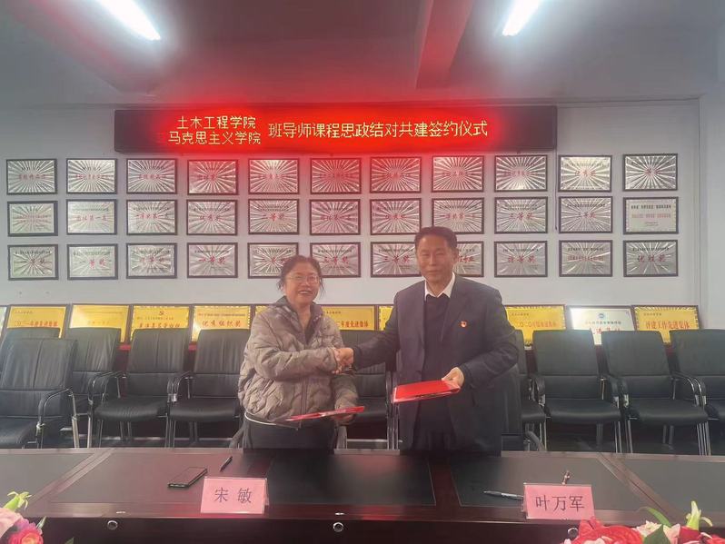 为深入贯彻落实教育部印发的《高等学校课程思政建设指导纲要》文件精神,促进思政课程与课程思政同向同行,充分发挥思政班导师的思想引领作用,马克思主义学院与土木工程学院于12月10日上午在土木工程学院会议室举行了班导师课程思政结对共建签约仪式。土木工程学院院长宋敏、马克思主义学院院长叶万军以及两院结对共建教师出席会议。共建仪式由土木工程学院副院长常秋影主持。