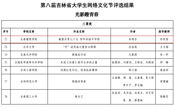 本次活动由吉林省教育厅主办,旨在深入学习贯彻习近平总书记关于网络强国的重要思想和关于教育的重要论述,引导师生积极参与网络文化建设。活动自开展以来,马克思主义学院积极组织教师参与创作申报,选送作品立足思政教育,采用微课、短视频等多种形式,充分展现思政课教师的专业能力与创新思维。其中刘赫男老师的作品《冰雪中的热血丰碑》,聚焦吉林地域红色资源,生动讲述东北抗联历史故事,将思政理论与地方历史文化深度融合,荣获优秀微课组一等奖;孙明丽老师指导的作品《翰墨丹青七十五青年共绘中华图》以真挚情感为底、深入浅出的理论为纲,生动诠释新时代青年学子的使命担当,尽显思政教育与艺术表达的融合之力,斩获“光影趣青春组”三等奖。